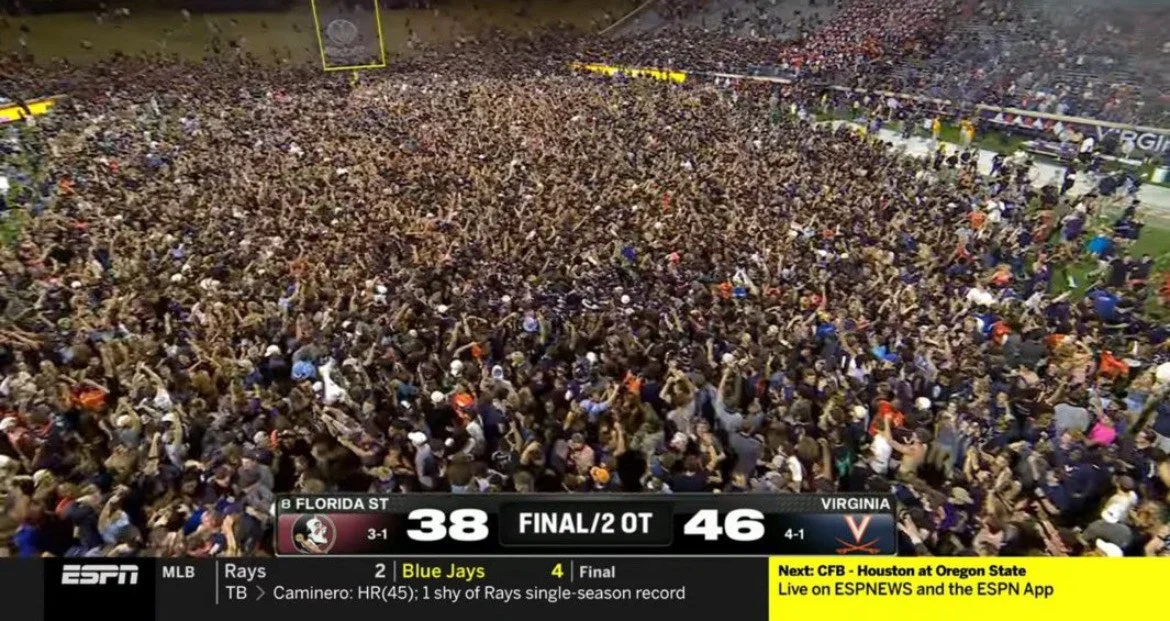 In my opinion though, the coolest moment of the night after an incredible game, upset, in primetime fashion we MUST give credit to the fans of Virginia in the student section. Scott Stadium was rocking all night, fans giving middle fingers, loud cheers, and school pride was on full display throughout the game. But the second FSU went for their last play on a 4th and 12 heave to the endzone and missed, THOUSANDS of fans sprinted on the field within 3 seconds. Trampling over FSU players and Virginia players alike. It was such a surreal experience to see it unfold that quickly. Their storming the field gained much traction on X and all over social media.